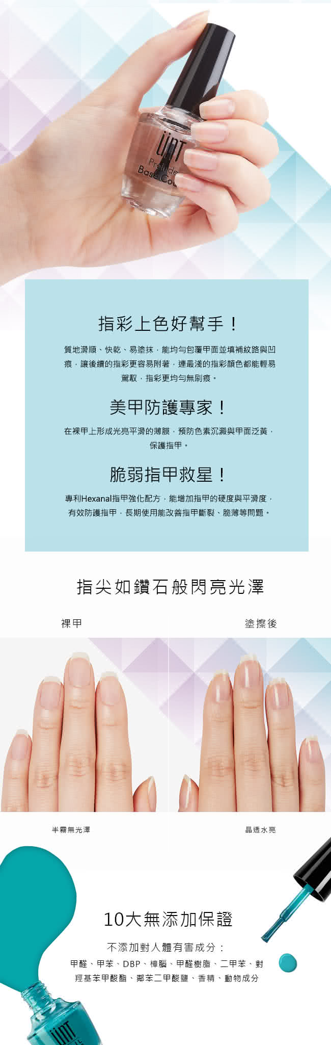 - 有效隔離、保護指甲,預防指彩色素沉澱與甲面泛黃